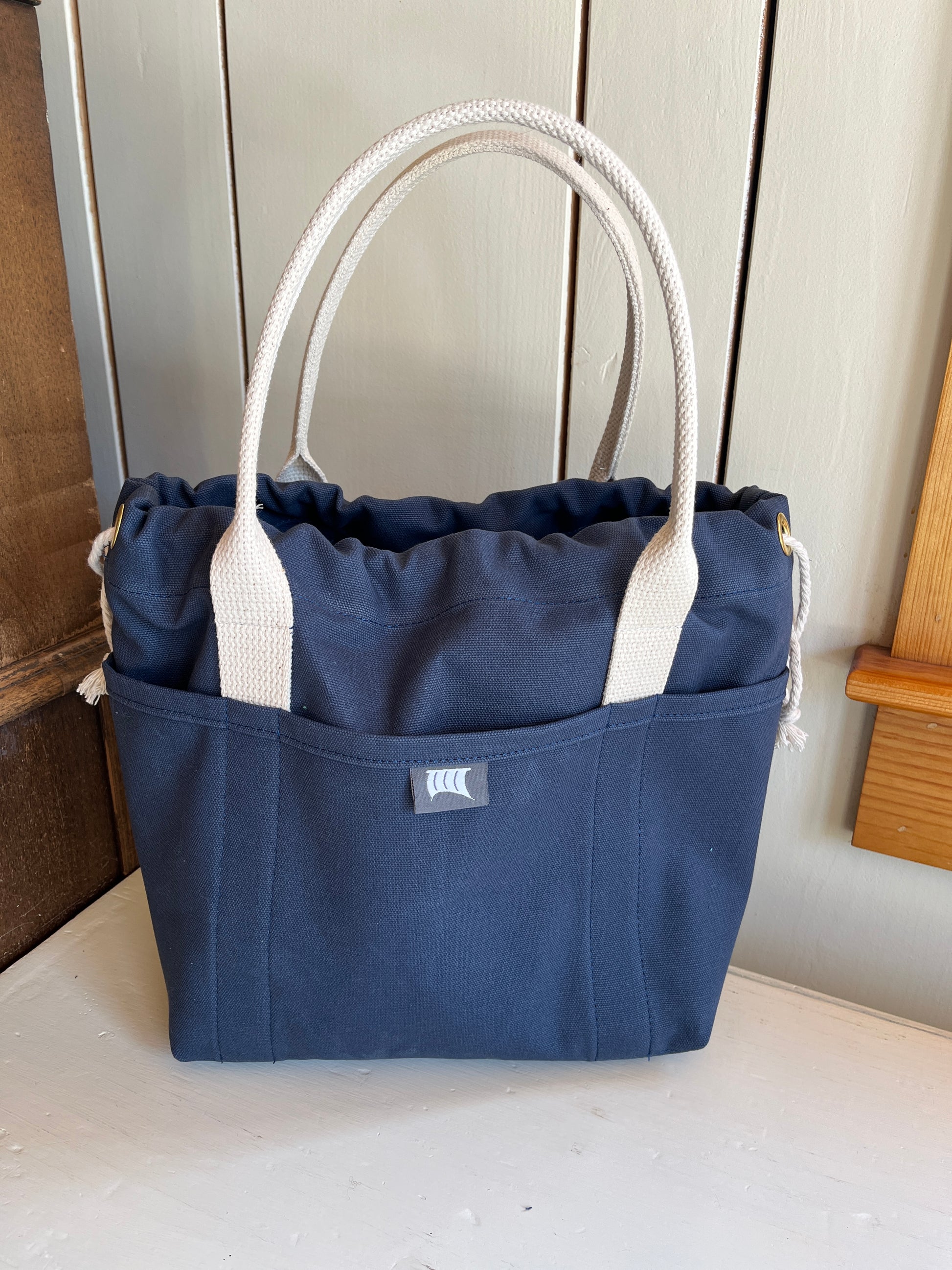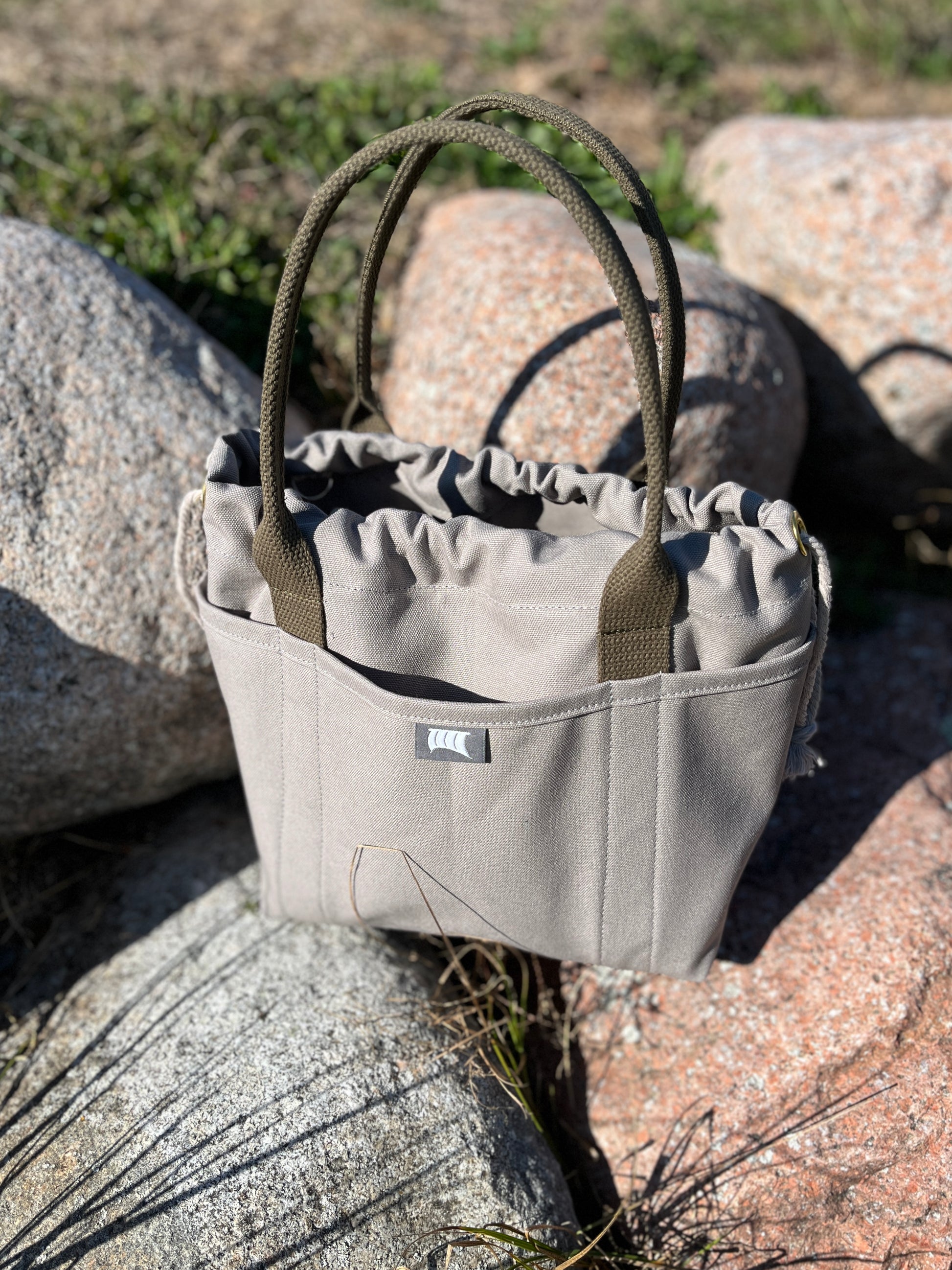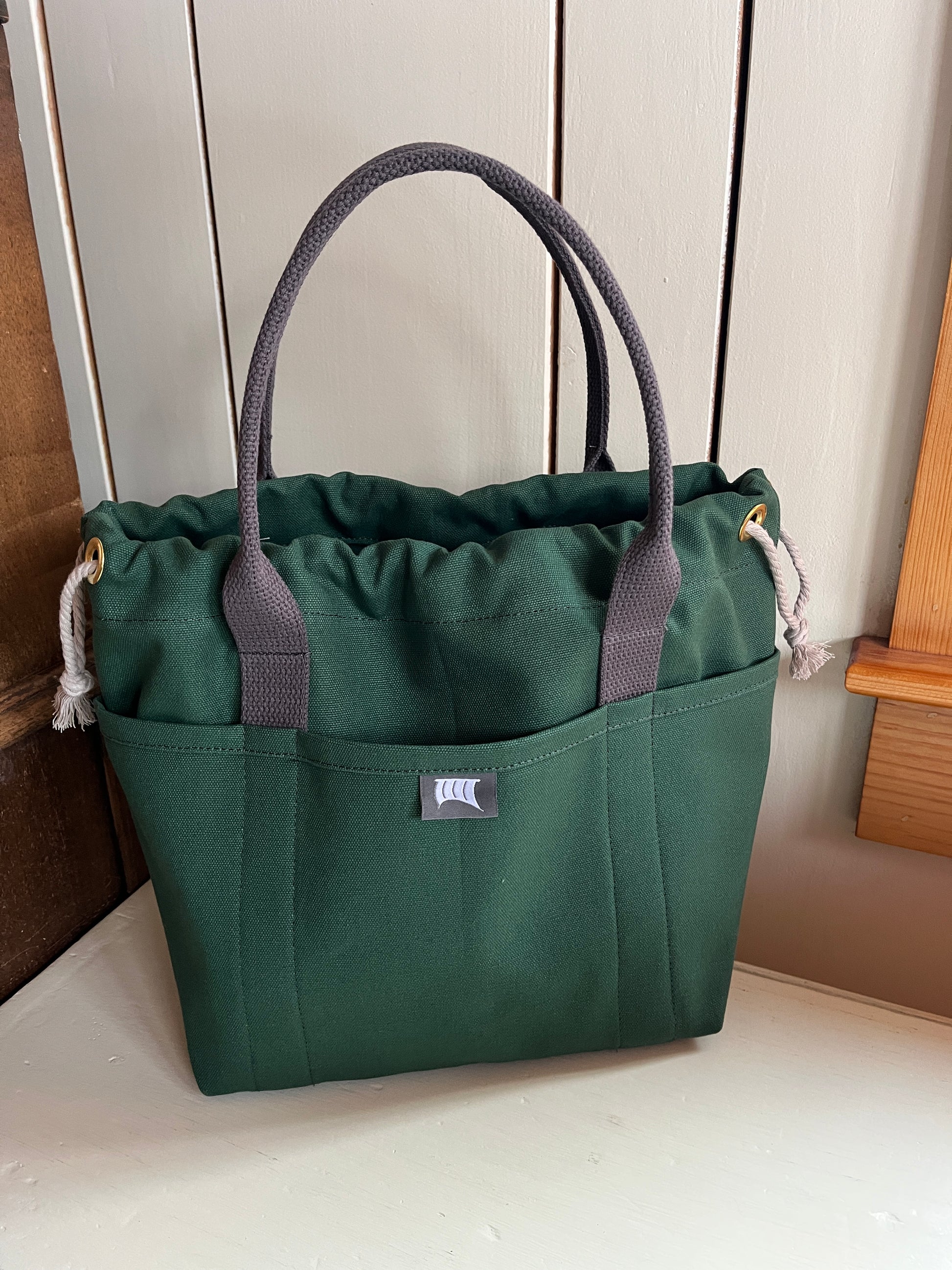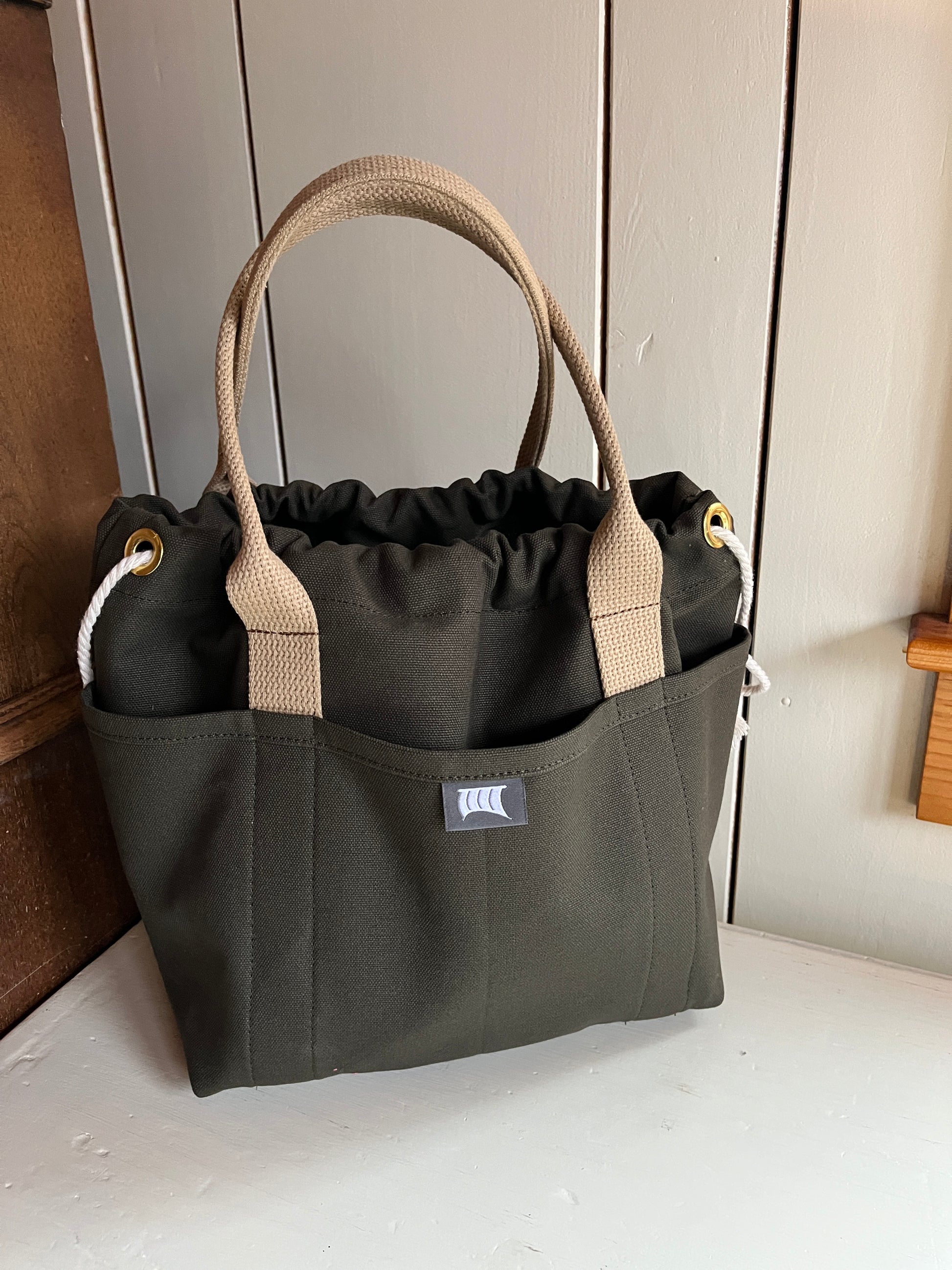 This is a redesign of The Heron, including features from The Ditty and The Gannet. It is a shorter tote with a drawstring top, 6 pockets around the outside, plus three pockets on the inside, and a key loop.