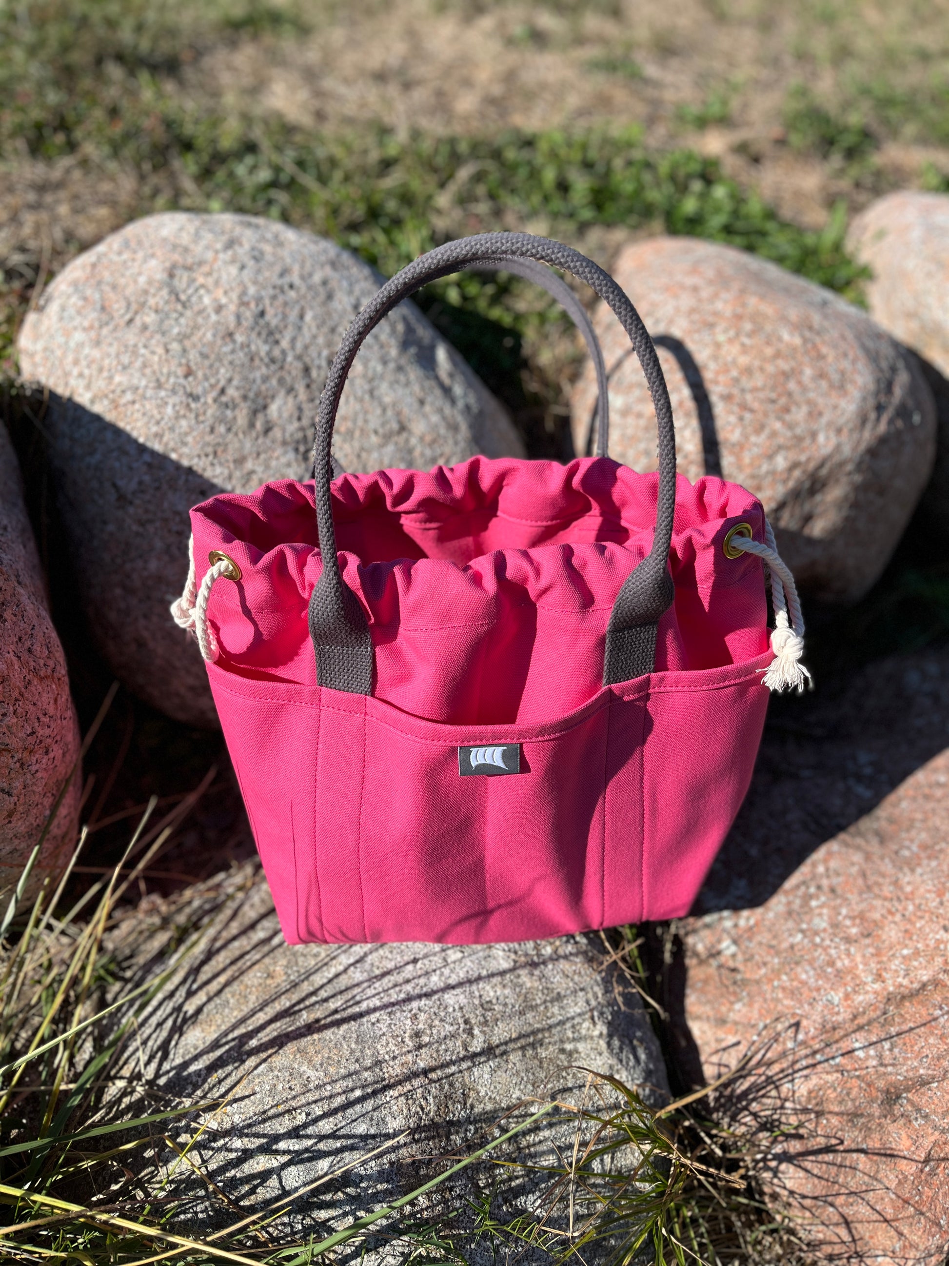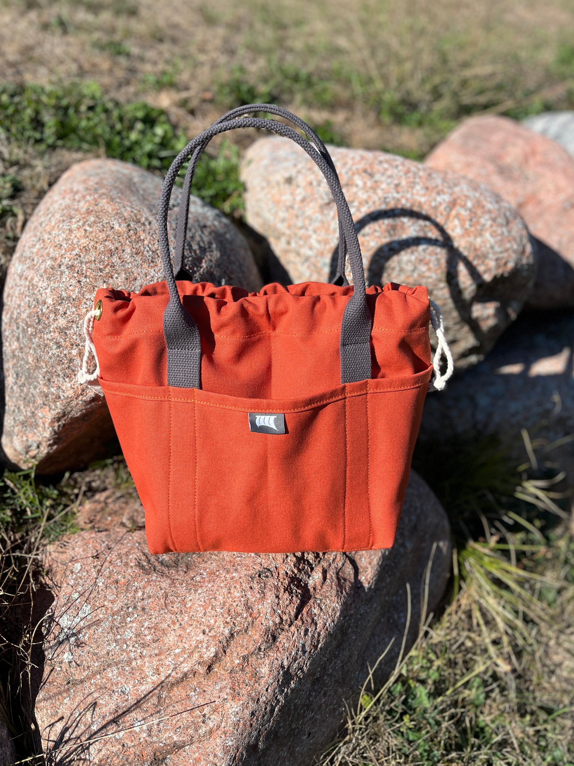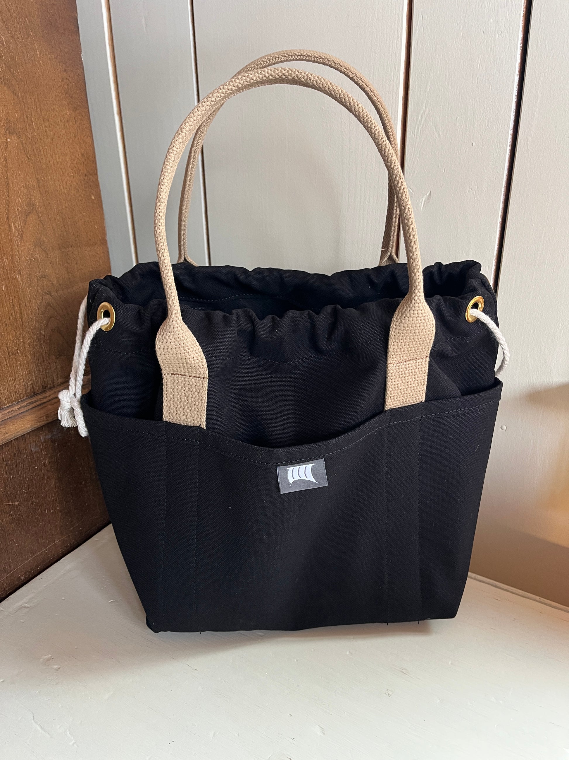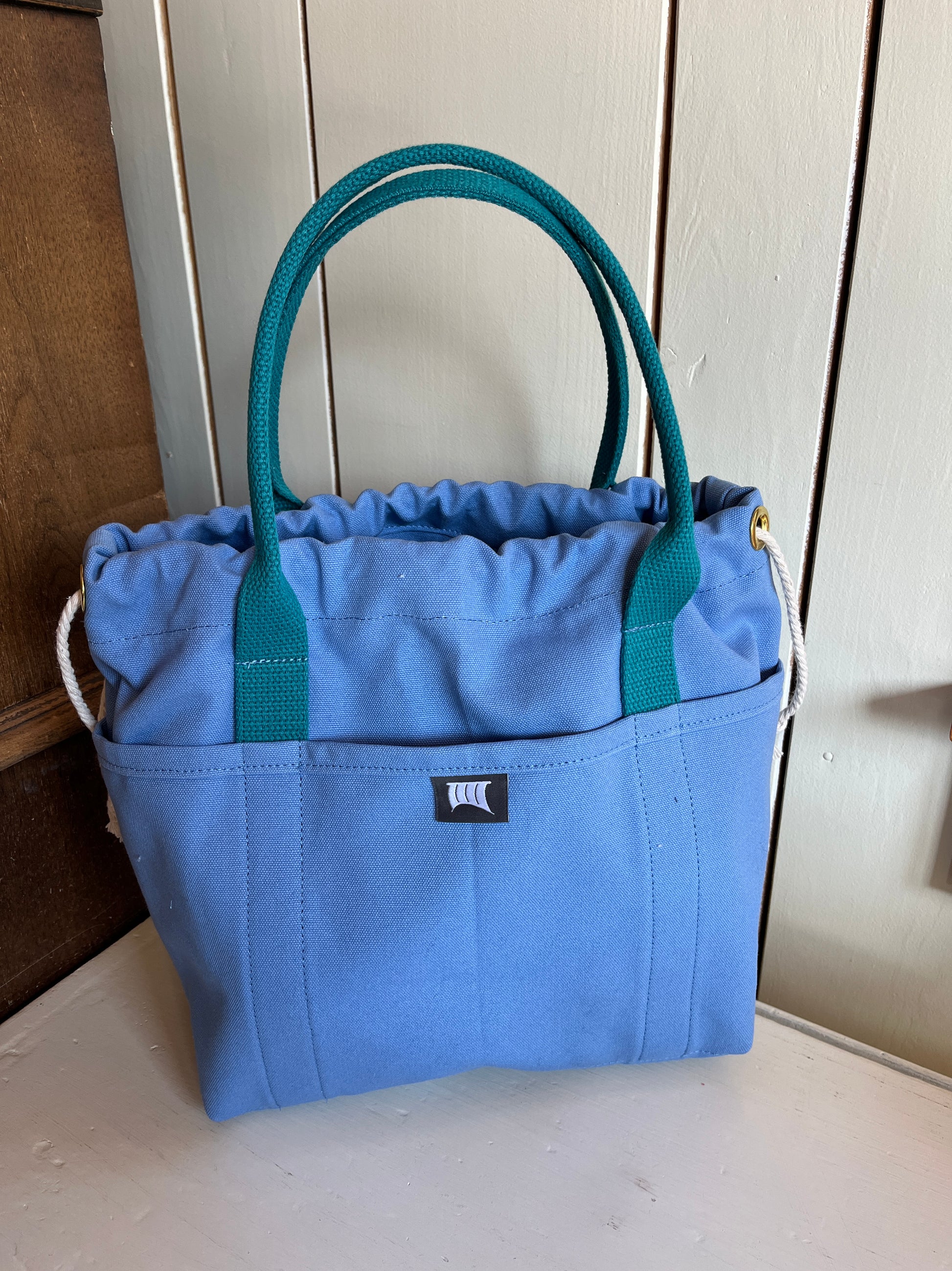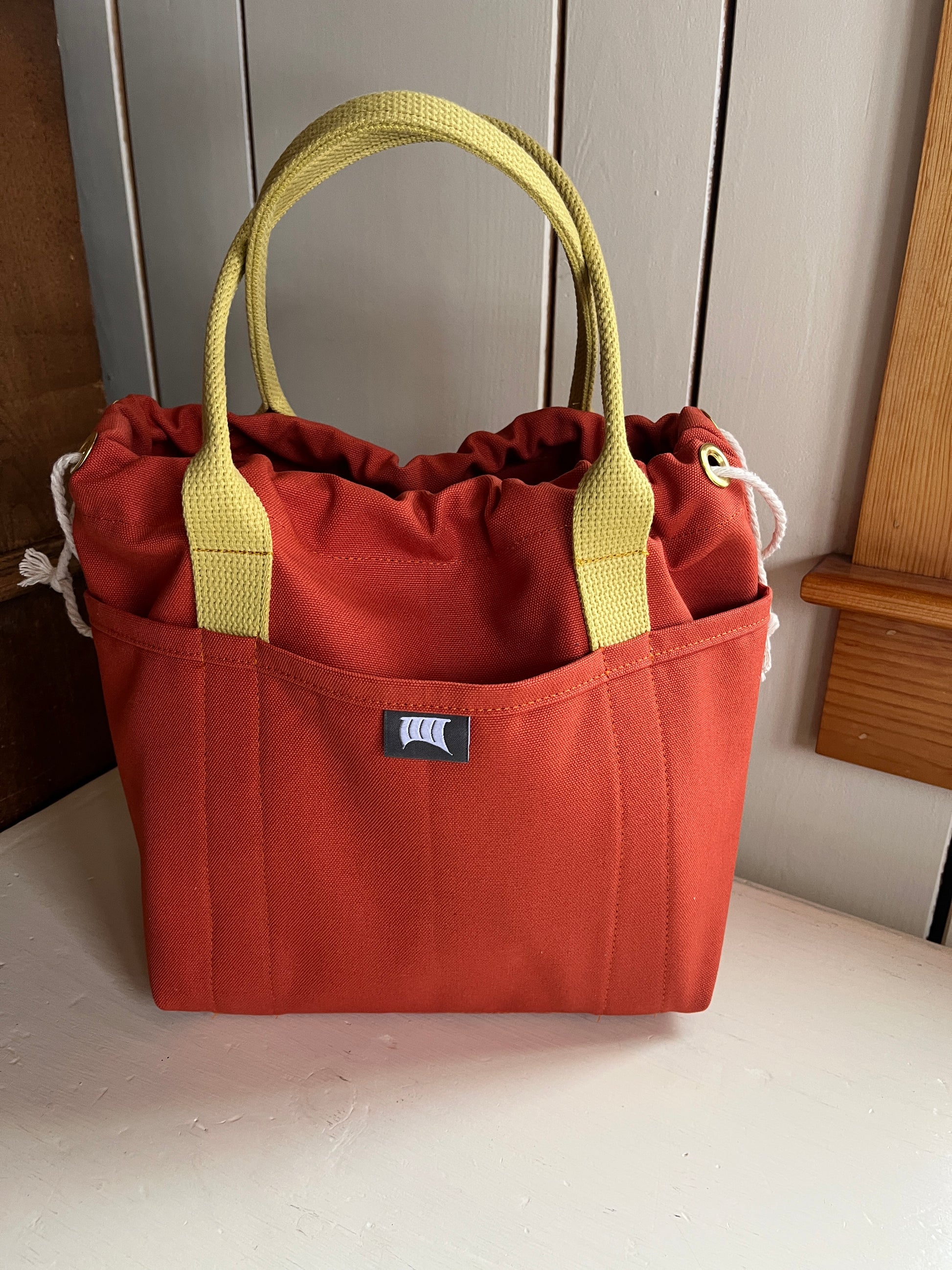 This is a redesign of The Heron, including features from The Ditty and The Gannet. It is a shorter tote with a drawstring top, 6 pockets around the outside, plus three pockets on the inside, and a key loop.