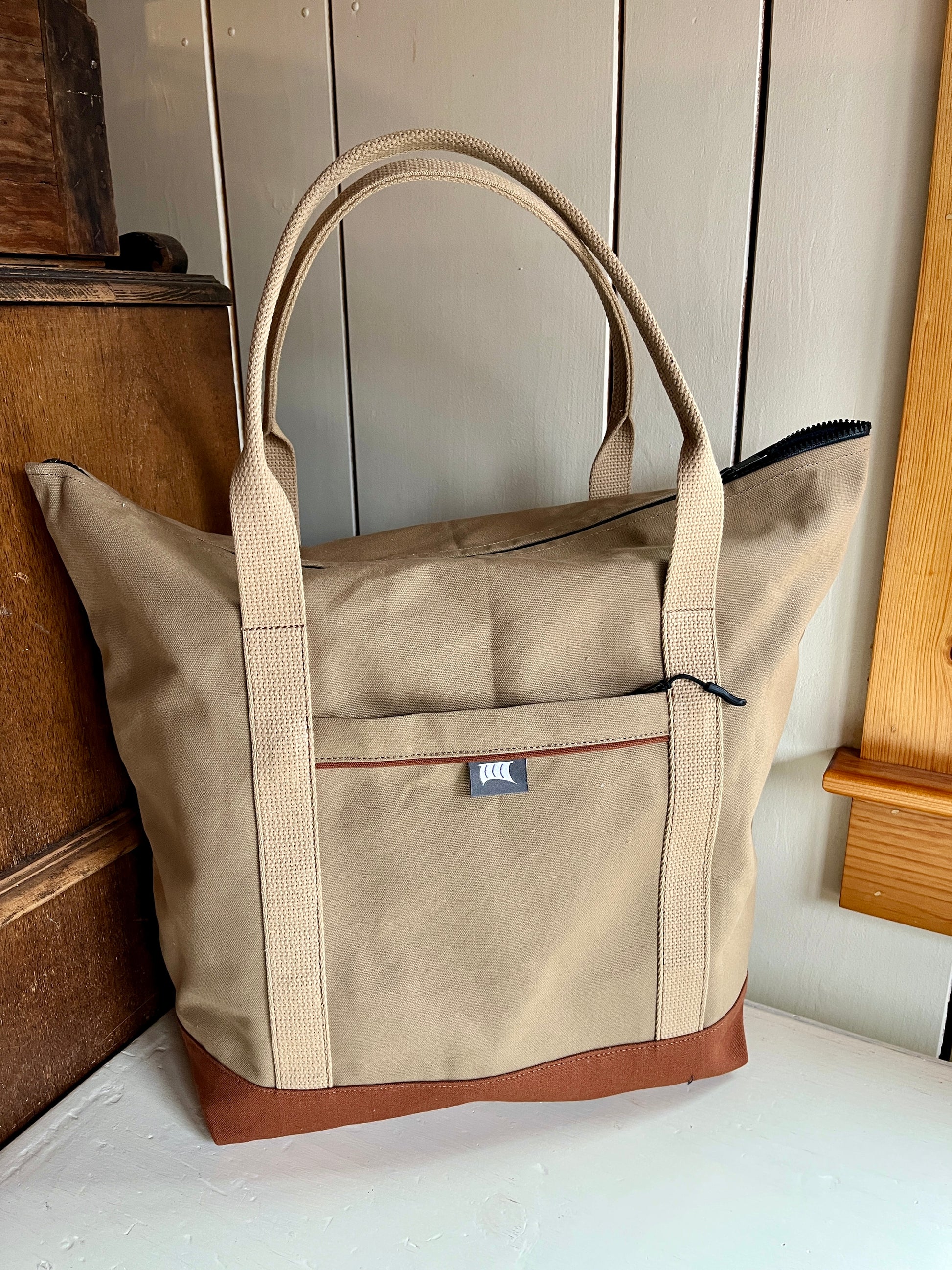 Materials: 15oz cotton canvas, cotton webbing, plastic tooth zippers.